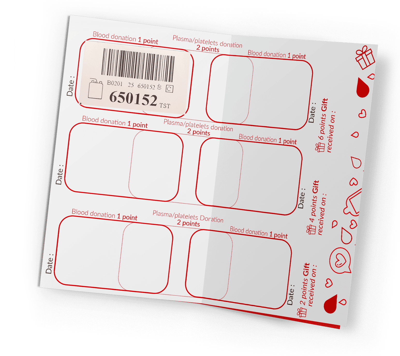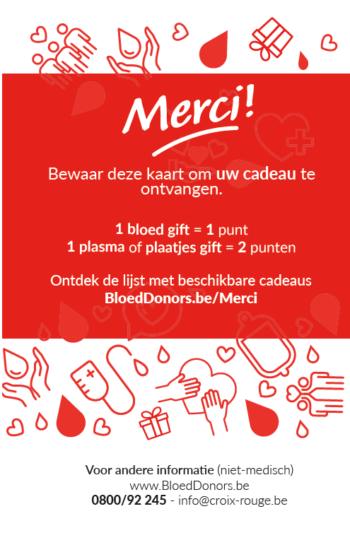 Bij elk bezoek aan een van onze inzamelpunten vult ons team uw KAART aan met een sticker, afhankelijk van uw gift. Zodra u het gewenste aantal punten hebt bereikt, kunt u ze inwisselen voor een cadeau naar keuze.